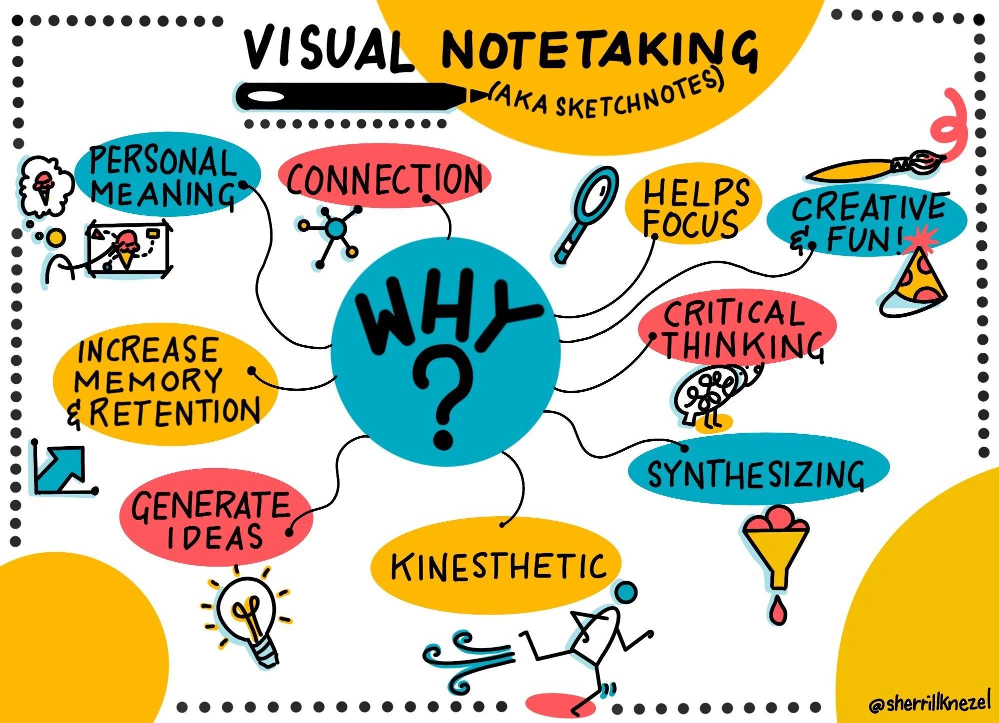 As a visual thinker and educator, I get asked all the time, “...but why should I teach or use visual note taking?” Visual notes (also called sketchnotes) add a wealth of benefits so I drew this visual to share!
